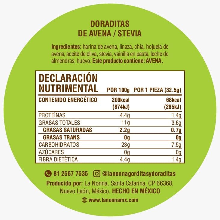 Harina de avena, linaza, chia, hojuela de avena, aceite de oliva, stevia, vainilla, leche de almendras, huevo. Contiene: 4 Piezas PUEDE CONTENER trazas de gluten por contaminación cruzada.