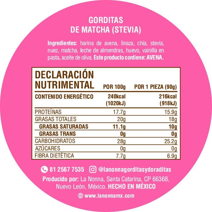 Harina de avena, linaza, chia, stevia, nuez, matcha, leche de almendras sin azúcar, huevo, vainilla,, polvo para hornear, aceite de oliva. Contiene: 3 Piezas PUEDE CONTENER trazas de gluten por contaminación cruzada.