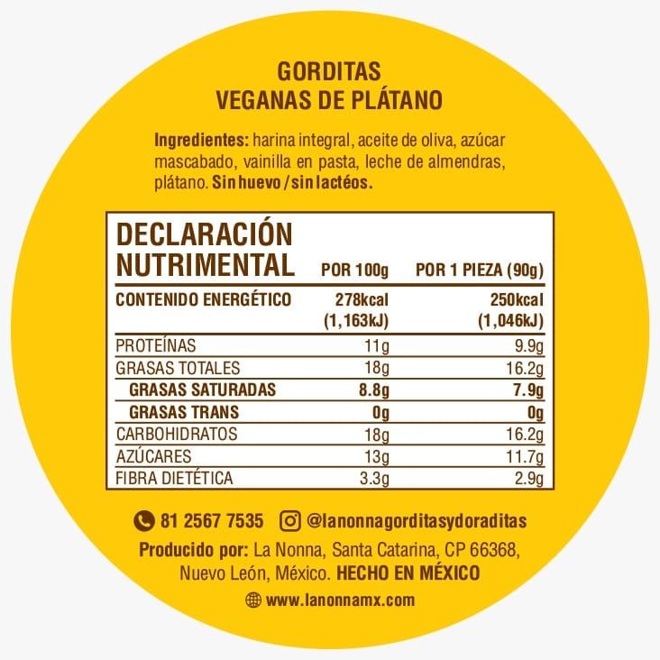 Harina integral, aceite de oliva, azúcar mascabado, vainilla, leche de almendras, plátano, polvo para hornear. SIN HUEVO/SIN LÁCTEOS. Contiene: 3 Piezas