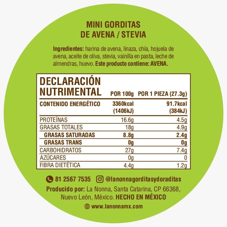 Harina de avena, linaza, chia, hojuela de avena, aceite de oliva, stevia, vainilla, leche de almendras, huevo, polvo para hornear. Contiene: 3 Piezas PUEDE CONTENER trazas de gluten por contaminación cruzada.