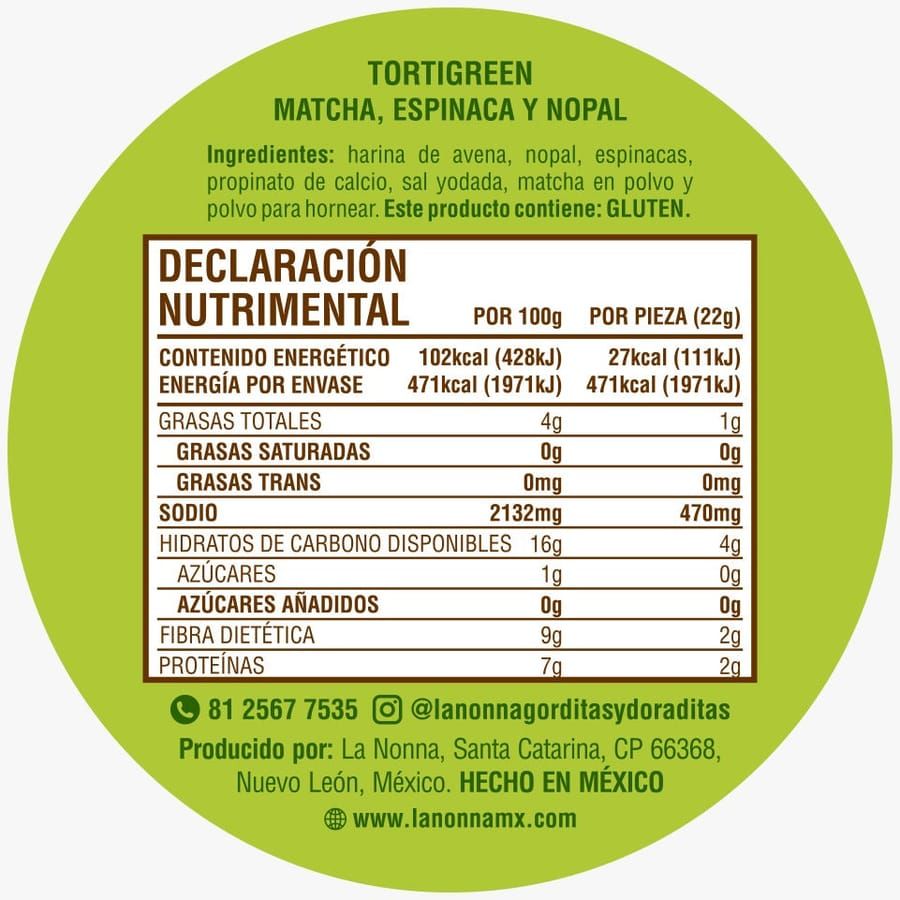 Ingredientes: harina de avena, nopal, espinacas, propinato de calcio, sal yodatada, matcha en polvo y polvo para hornear. Este producto contiene Gluten. PUEDE CONTENER trazas de gluten por contaminación cruzada.