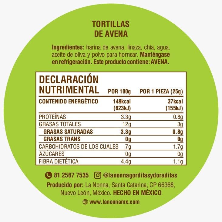 Harina de Avena, Linaza, Chia, Agua, Aceite de Oliva, Polvo para hornear. Mantenerse en refrigeración. Contiene: 20 Piezas